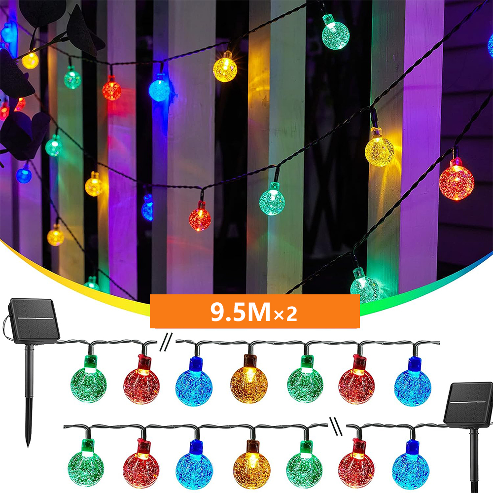 Solar String Lights Outdoor Waterproof, 2 Pack 50 LED 9.5M Each, Crystal Globe Lights with 8 Lighting Modes, Solar Powered Patio Lights for Garden