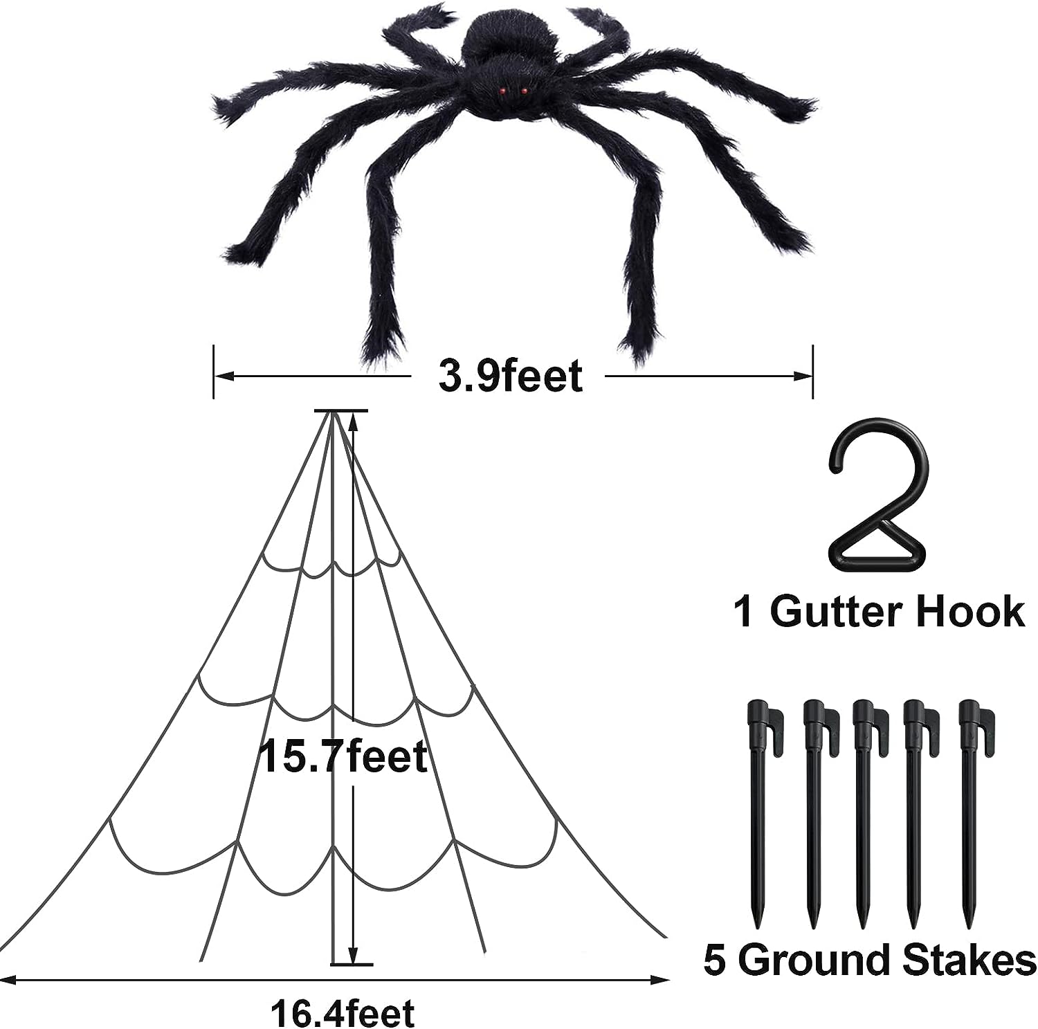 【Giant Spider Web Set for Halloween Decoration】1 Triangle Giant spider web (16.4 ft*15.8 ft) +1 Huge Halloween spiders (3.94 ft/48 inch), 1 hook (for the gutter ) and 5 nail (for the ground). All in One Set, Super Value Pack for Halloween Decoration.