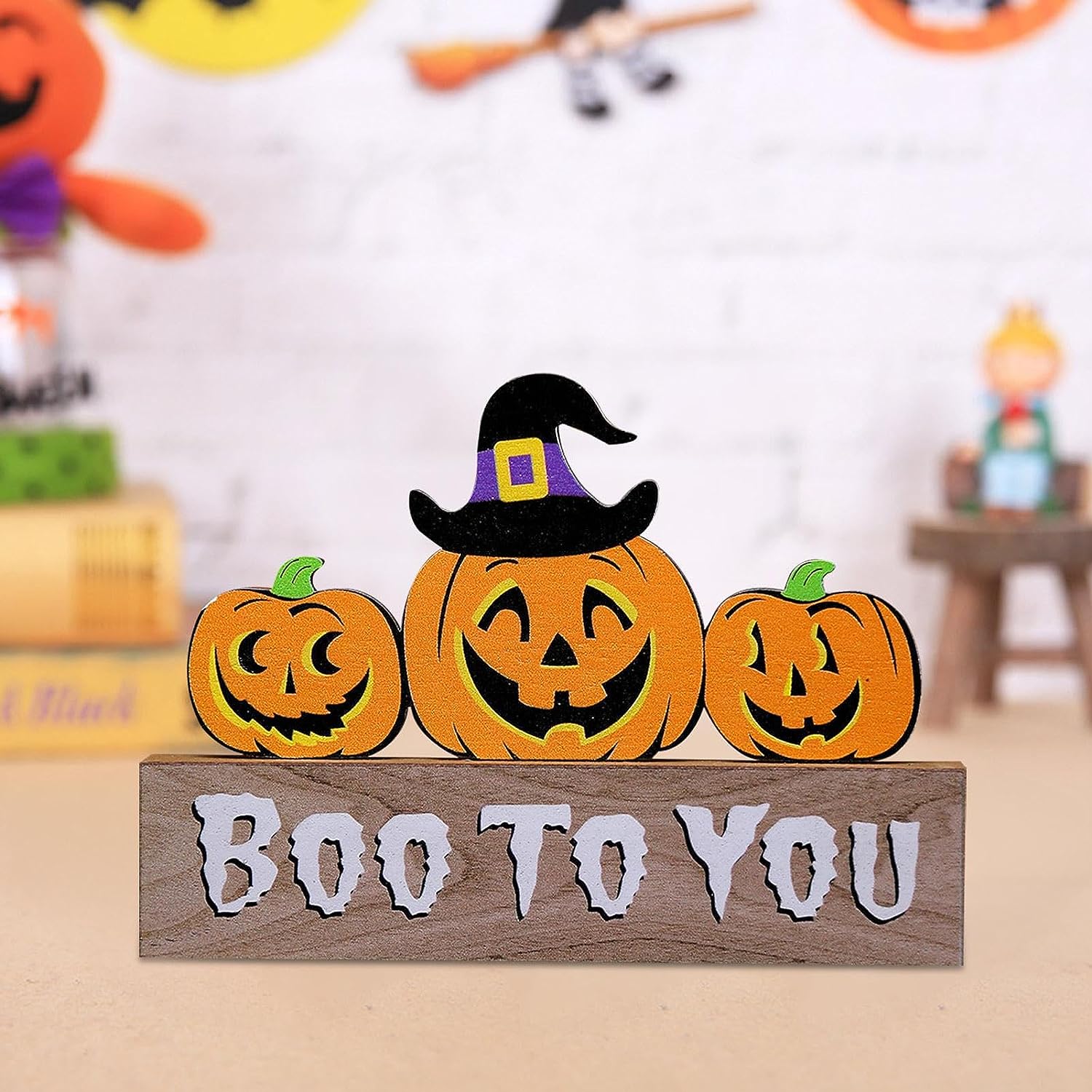 Halloween Wooden Decorations, Cute Pumpkin Ghost Cat Crafts Decor, Farmhouse Rustic Signs for Tiered Tray, Shelves, Table, Desk, Bookshelf, Fireplace