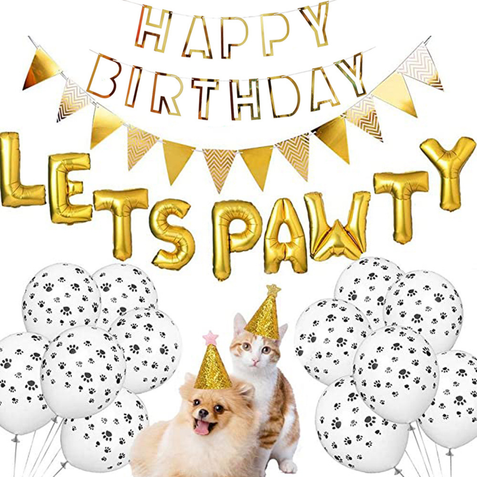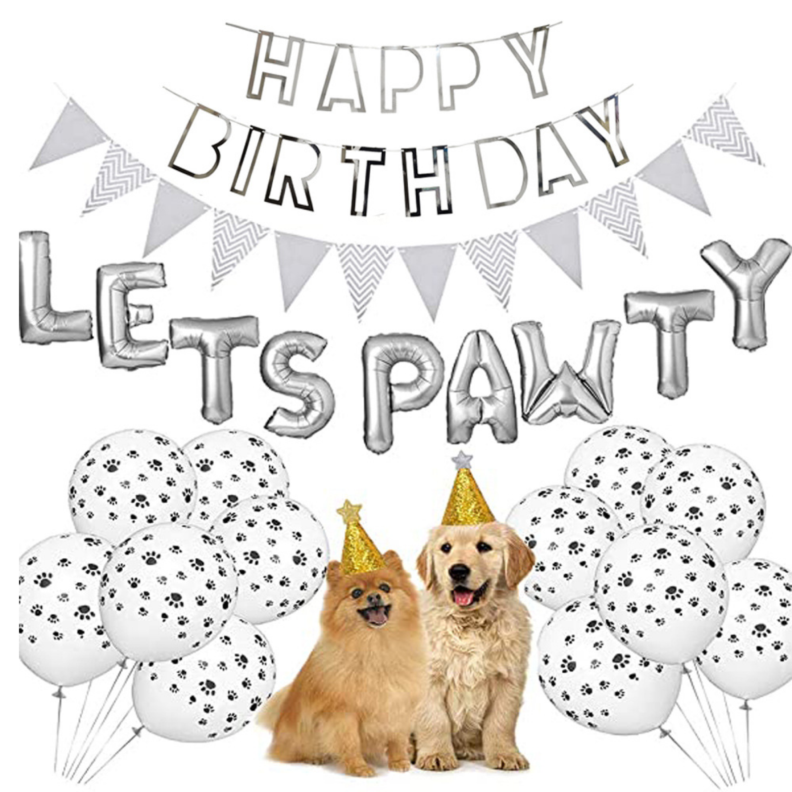 Let's Pawty Design: The balloons feature the phrase ""Let's Pawty"" in colorful and playful letters, adding a touch of excitement to your birthday celebration. Perfect for pet lovers or anyone who wants to have a pawsitively great time.
