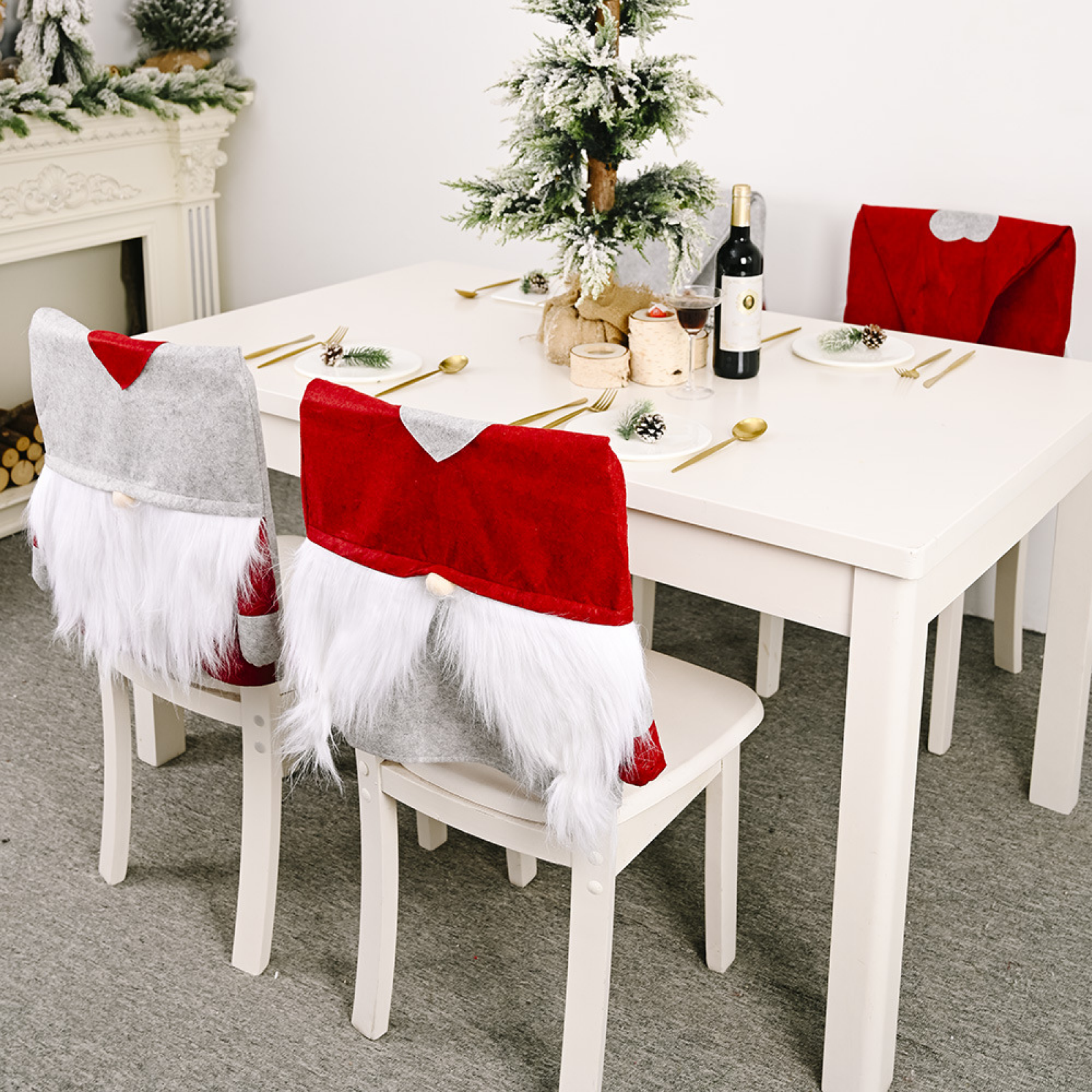 Heartwarming Christmas Decor: Create a cozy and festive atmosphere with our set of 4 charming Christmas decorations. This set includes heartwarming forest Santa chair covers, adorable faceless doll chair covers, and non-woven fabric chair covers.